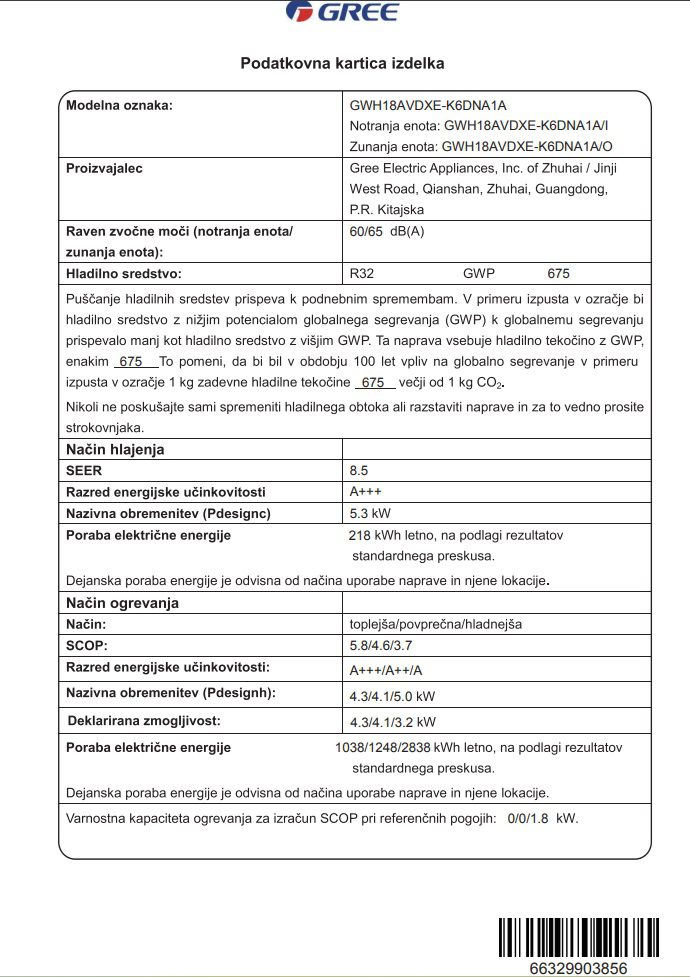 | Oznaka zunanje enote | GWH18AVDXE-K6DNA1A/0 |