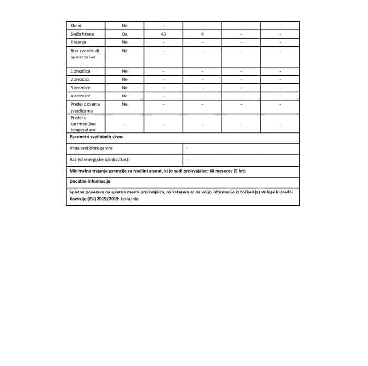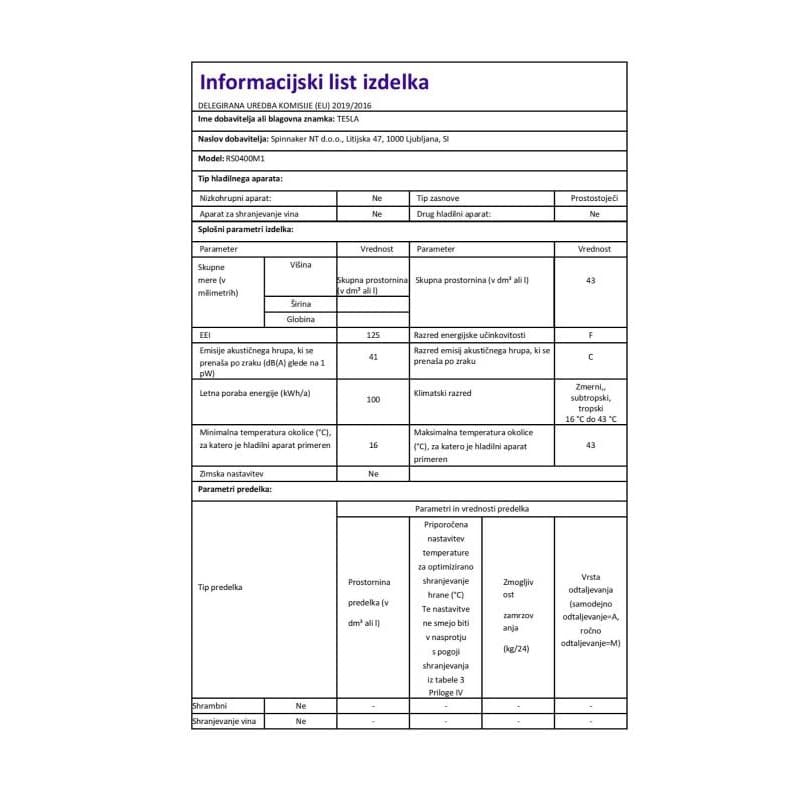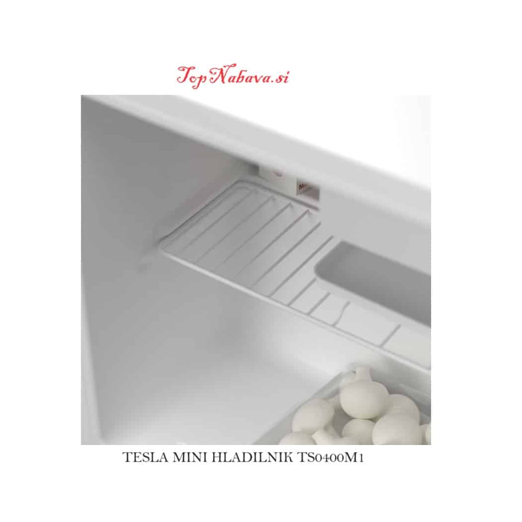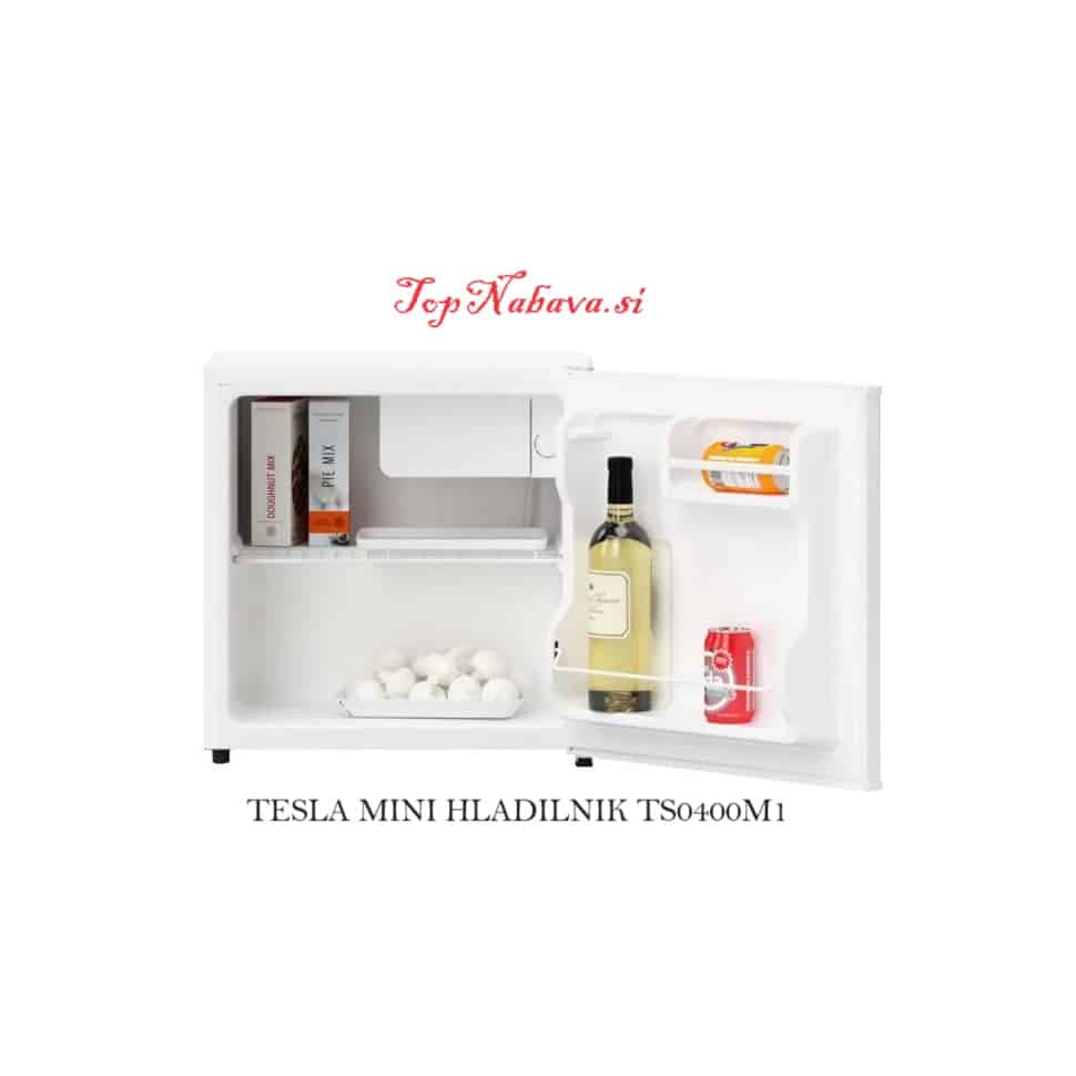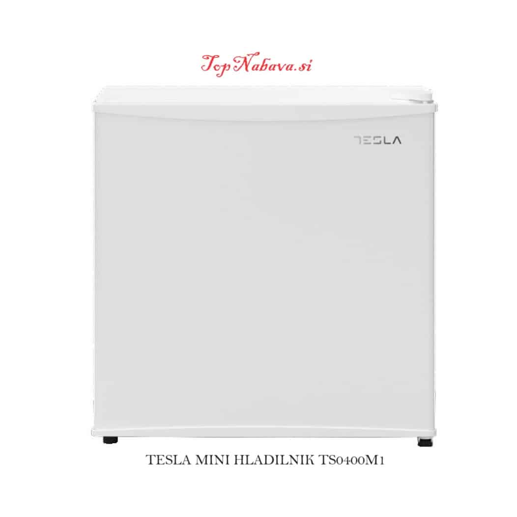- Tesla mini hladilnik RS0400M1 Enovratni mini hladilnik s 43 litri prostornine je odličen za kampiranja, pisarne, počitniške hišice, itd. Spada v energijski razred F in klimatske razrede N, ST, in T. Odlikujeta ga tiho delovanje in elegantna zasnova. Upravljanje je mehansko, odtajevanje hladilnika pa ročno. V notranjosti najdete 1 mrežasto polico in 2 vratna predala. Dimenzije hladilnika merijo 47,2 × 45 × 49,2 cm.