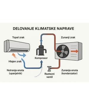 Notranja enota (uparjalnik): Topel zrak iz prostora prehaja čez hladne cevi, kjer hladilno sredstvo absorbira toploto, s čimer se zrak ohladi.